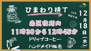 12月ひまわり横丁 2025年12月15日 by 就労継続支援B型事業所 ヴェルデ南区役所内にて授産品を販売させて頂きます。その名も「ひまわり横丁」ひまわりは名古屋市南区の区の花ですね今月は12月18日木曜日です。ハンドメイド品、ドリップコーヒーを販売します。皆様のご来場をお待ちしております♪